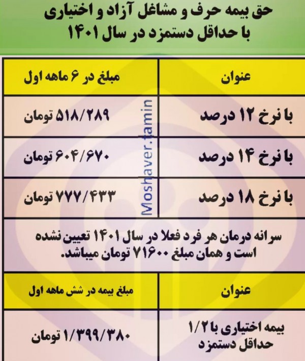 حق بیمه خویش فرما ( بیمه مشاغل آزاد و بیمه اختیاری ) در سال 1401 در جدول زیر آمده است: